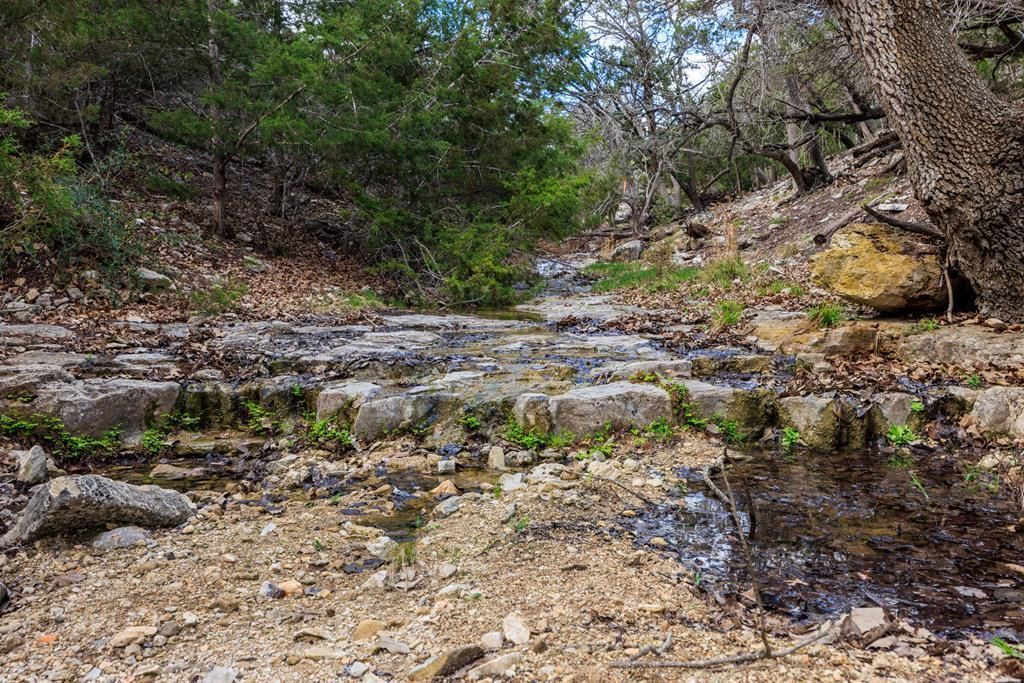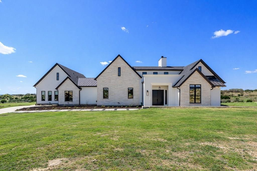 Set on over five acres in gated Loma Vista Ranch, this striking Hill Country estate unfolds as an experience, one that feels both architecturally bold and effortlessly livable from the moment you arrive. Clean lines and expansive scale create a sense of quiet sophistication, while warm hickory floors and curated finishes soften the space, inviting you to settle in and stay awhile. The home was designed for both everyday comfort and exceptional living. With four bedrooms and five baths, including a private guest suite, the layout offers flexibility without sacrificing intention. Tucked away as its own retreat, the primary suite is a true sanctuary; heated floors underfoot and a spa-inspired bath that feels more like a destination than a necessity. A glass-enclosed walk-through double shower, a freestanding soaking tub framed by picture windows and sweeping Hill Country views create a setting that is equal parts serene and indulgent. Thoughtfully designed for both beauty and function, the home features expansive custom closets and a dedicated glam room perfectly suited for elevated daily routines or full-scale hair and makeup preparation. At the heart of the home, the kitchen makes a statement. A dramatic Taj Mahal quartzite island anchors the space, surrounded by 54 inch custom maple soft-close cabinetry, a 48 propane range, double ovens, double dishwashers, dual refrigerators and a full scullery pantry designed to perform just as beautifully as it presents. Overhead, soaring ceilings and exposed beams add architectural presence, while walls of glass open seamlessly to the outdoors, blurring the line between inside and out. Step outside and the experience continues. The backyard unfolds like a private resort centered around a 21,000-gallon pool, expansive patios, an outdoor fireplace and a fully equipped outdoor kitchen, all positioned to take in uninterrupted views of the surrounding acreage.