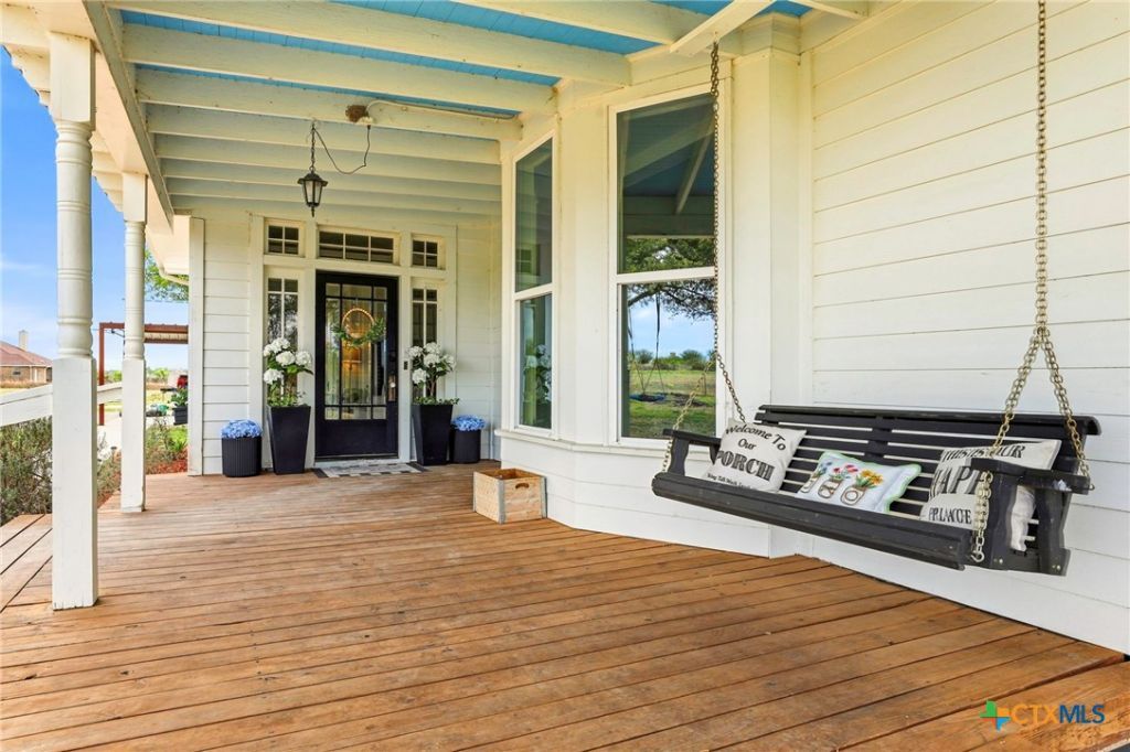 Classic Hill Country elegance meets modern comfort in this beautifully renovated farmhouse set on 13.7 acres in Guadalupe County. This 4-bedroom, 2.5-bath residence blends timeless character with thoughtful updates, showcasing shiplap walls, original hardwood floors, warm wood-paneled ceilings, and a brick fireplace that anchors the inviting sitting room. The kitchen pairs style and function with a farmhouse sink, concrete-inspired countertops, and open shelving?creating a clean, elevated aesthetic ideal for both everyday living and entertaining. Life here extends beyond the walls. Start your mornings on the covered front porch swing, host gatherings beneath the expansive pavilion, or enjoy wide-open pasture framed by mature trees and endless Texas skies. Whether you envision peaceful country mornings, outdoor recreation, or space for hobbies and animals, this property offers unmatched versatility. Located within highly regarded Navarro ISD and just minutes from San Marcos and New Braunfels, this home delivers refined country living with convenience, charm, and room to breathe.